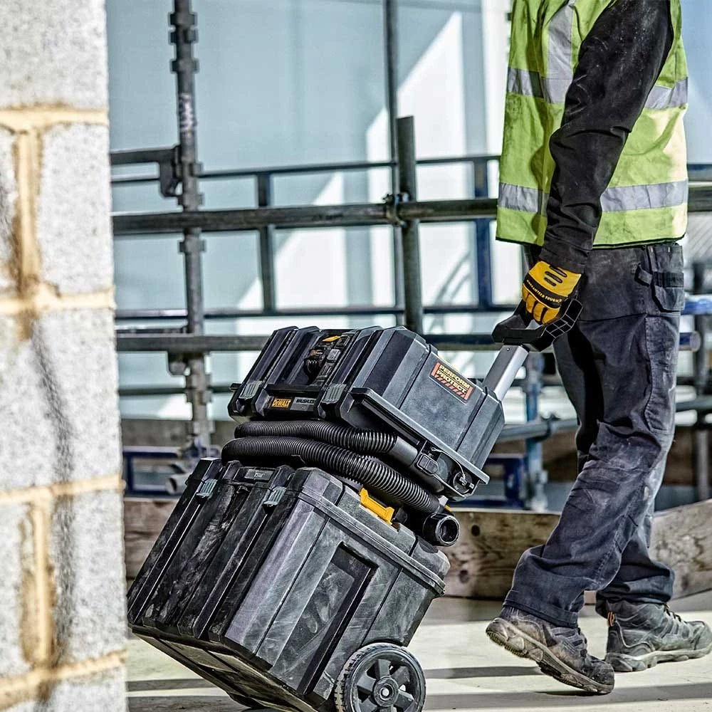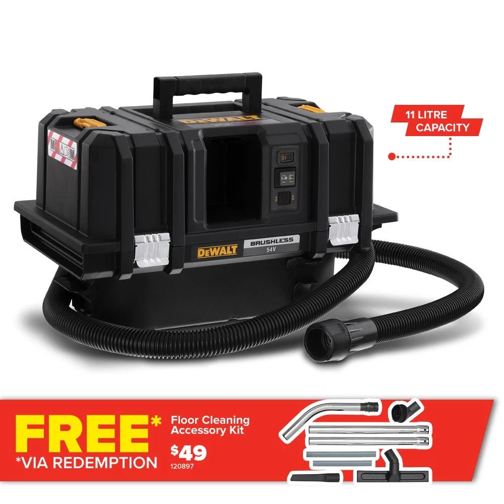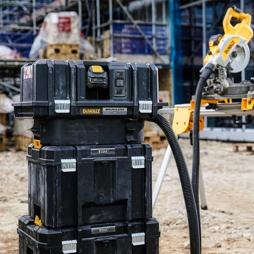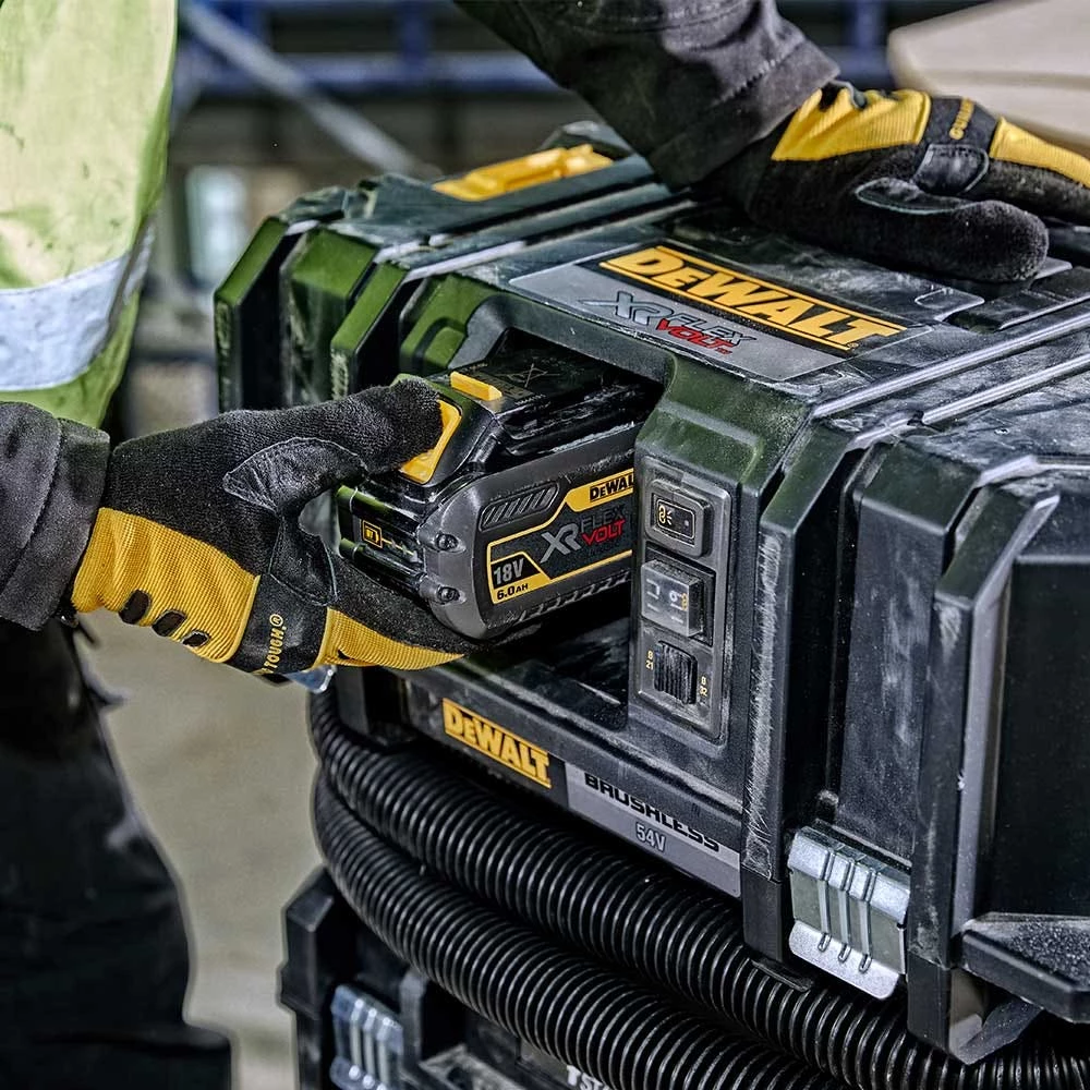 Powered by 54V XR FLEXVOLT technology the DCV586M is the ultimate dust extraction solution for a new generation of cordless tools and the key to unlocking the cordless jobsite. The DEWALT brushless motor and high capacity XR FLEXVOLT battery coupled with dual M-Class certified filters with automatic cleaning delivers powerful, constant performance and runtime for the most demanding applications. Other features include a remote for wireless operation, a recessed battery housing to protect from jobsite conditions, and TSTAK compatibility.